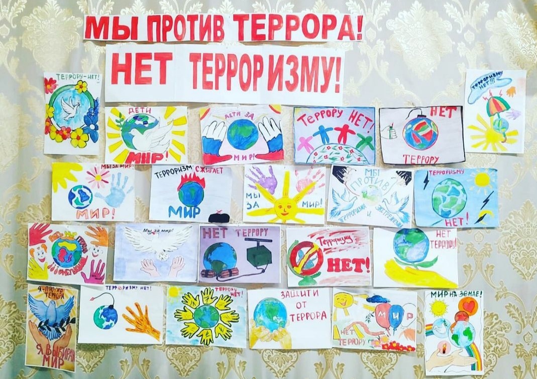 03.09.2021Воспитатели старших групп Мальсагова З.С. и Элдерханова П.М. провели выставку детских рисунков "Мы за мир, против терроризма!", приуроченный ко Дню солидарности в борьбе с терроризмом. Целью выставки является: -формирование гражданской позиции у дошкольников к проявлению терроризма через детское творчество. Основными задачами выставки являлись: