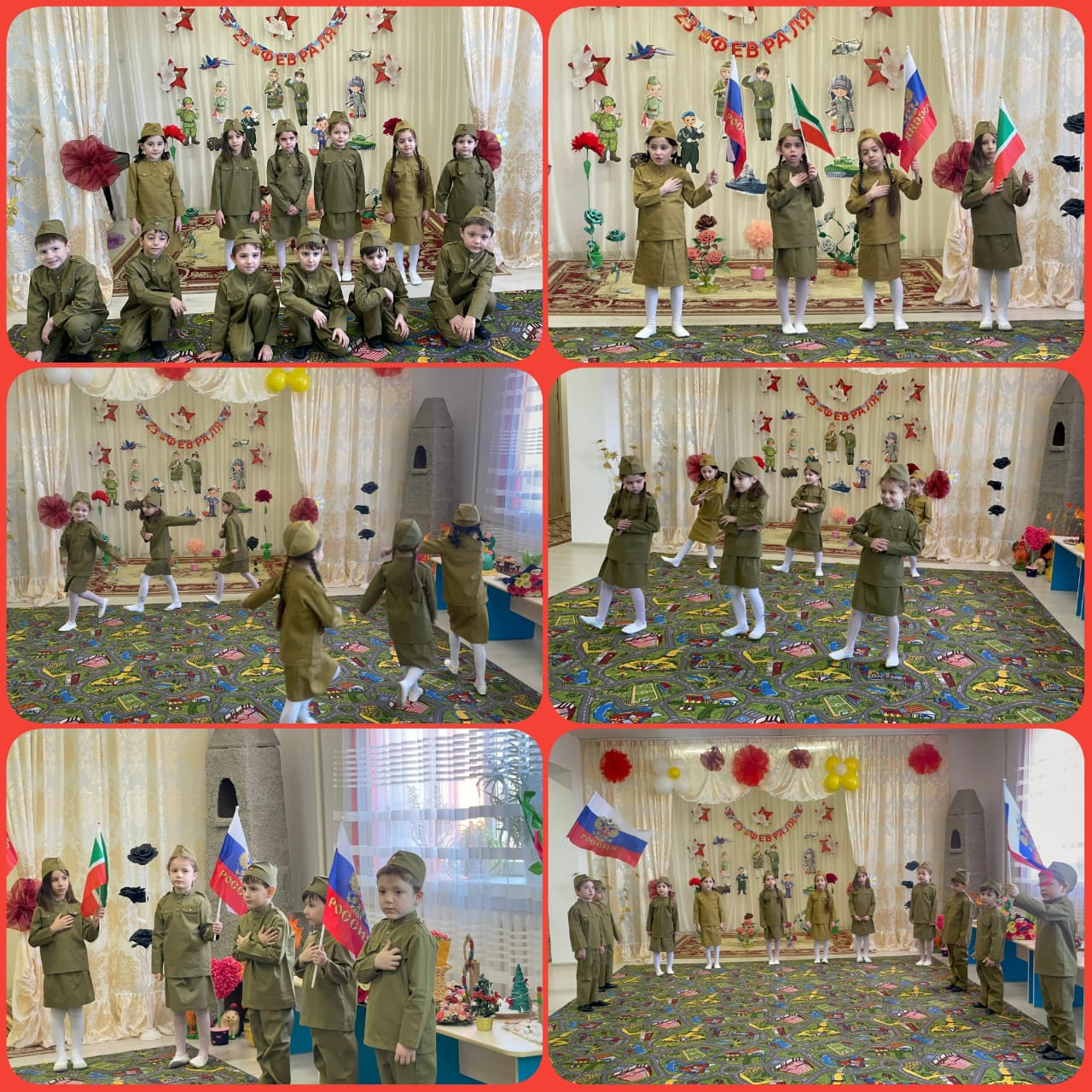 Накануне праздника дети были привлечены к активному участию в подготовке к празднику в убранстве группы, к изготовлению подарков папам, дедушкам, братьям. У детей развивался интерес к познавательным развлечениям, Воспитывалось желание быть похожими на воинов Российской Армии, стремление стать защитником Родины и принимать активное участие в праздничных выступлениях.