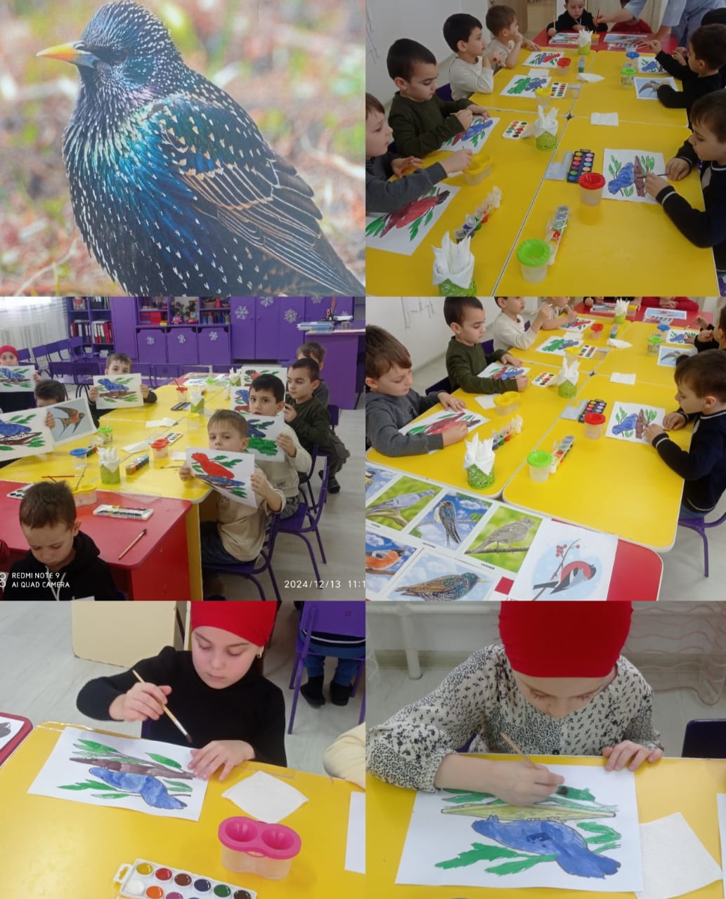 16.12.2024Воспитатель средней группы "Зайчата" Исмаилова П.Т. провела занятие с детьми по рисованию на тему:«Птицы синие и красные». Педагог учила детей передавать в рисунке образ, подбирая соответствующую цветовую гамму.Учила красиво раскрашивать птиц, закрепляла умение рисовать акварелью и правильно пользоваться кистью и красками.